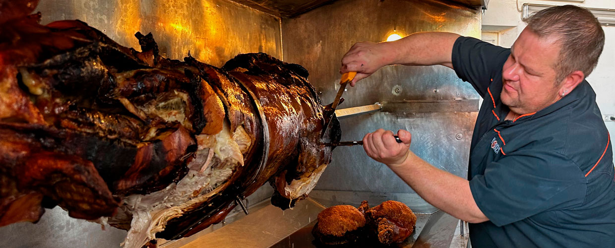 Frisch zubereitetes Spanferkel direkt vor Ort